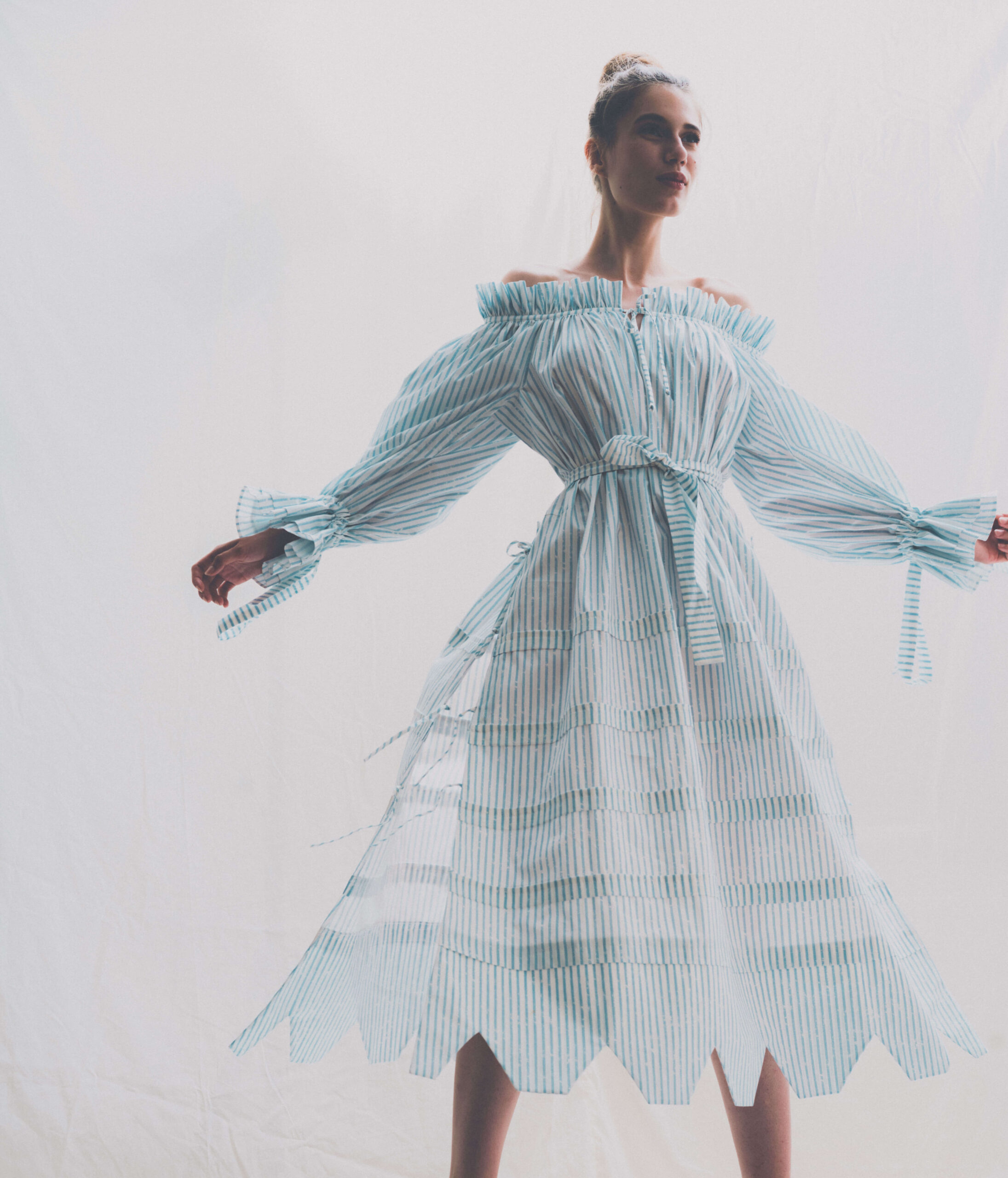 Cotton caftan dress with handmade finishing touches, curly decolletage and trimmed “wolf’s neck” type finish.