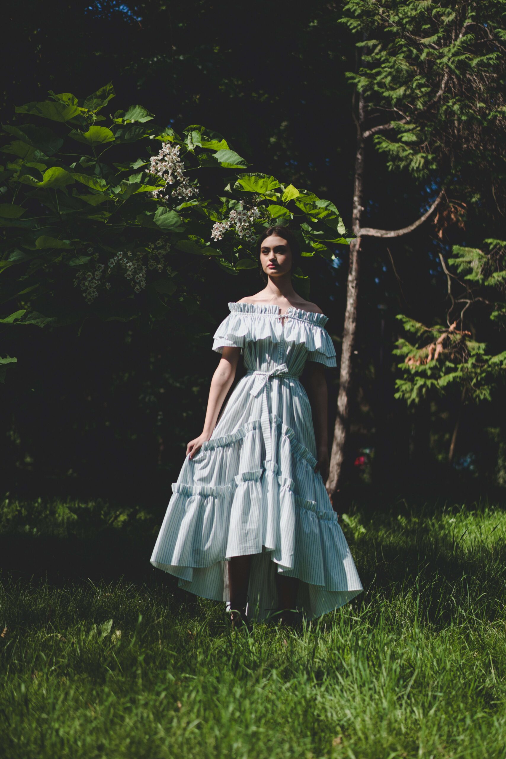 With delicate ruffles and a curly decolletage, the cut is asymmetrical, being longer in the back.
