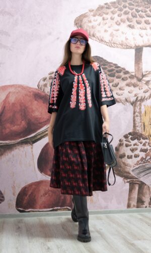 De culoare neagra, contrastand cu ‘aripi’ din batist in dungi alb-negru si mesaj statement despre iubire și umanitate. Imprimeria digitala de pe verso, printre modelele cele mai frumoase ale acestei linii, in care predomina azuriul, unul din stalpii cromatici ai romanitatii.