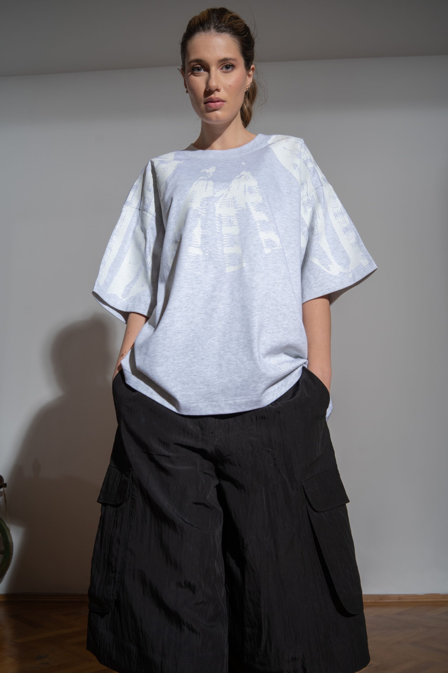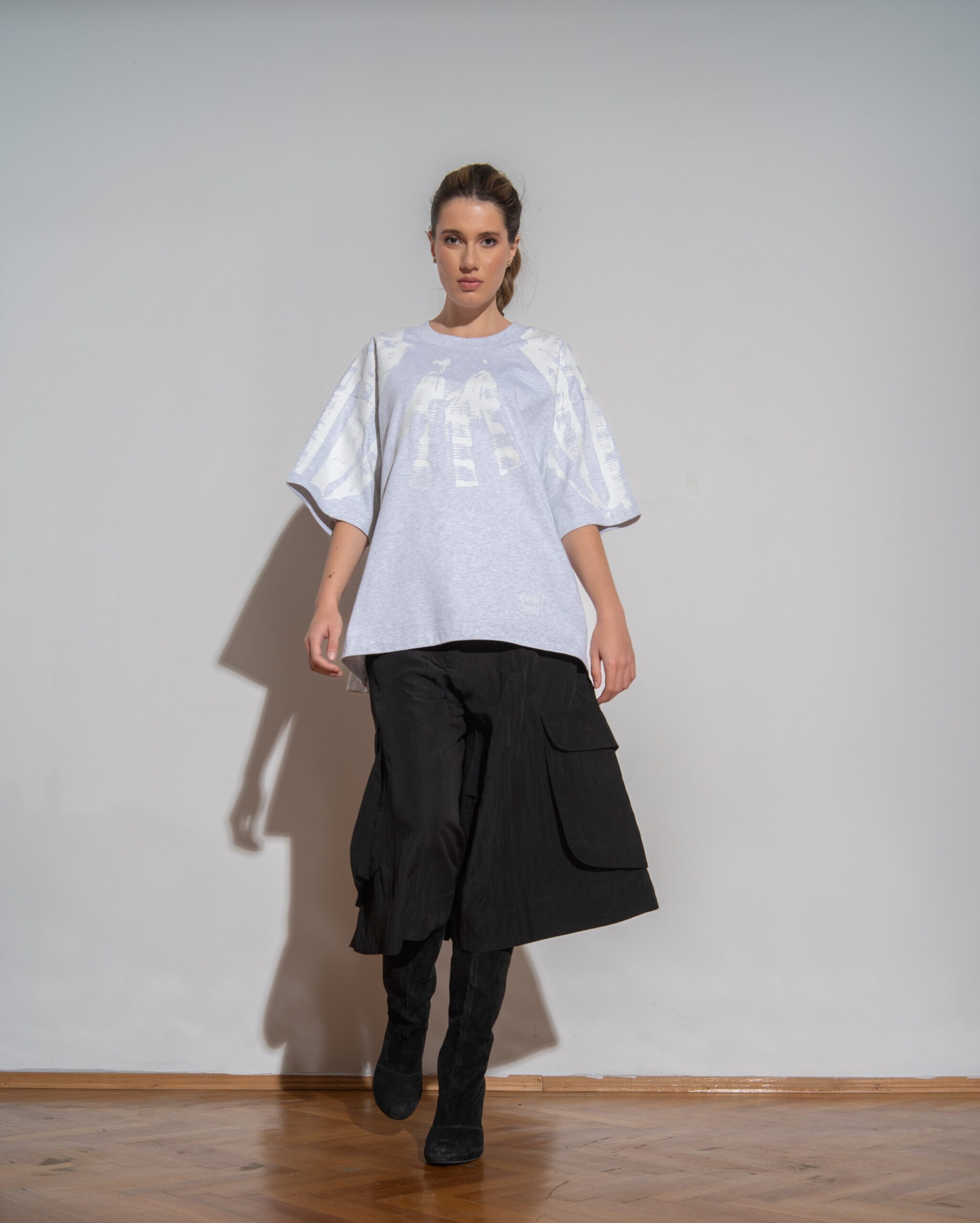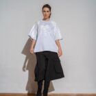 De culoare neagra, cu print aplicat manual, tricoul are in jurul taliei doua snururi, care pot fi legate in fata sau in spate pentru o talie marcata. Pe conturul logo-ului, am brodat, cu acelasi rosu, pentru a sublinia importanta mestesugului in brandul nostru.