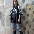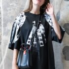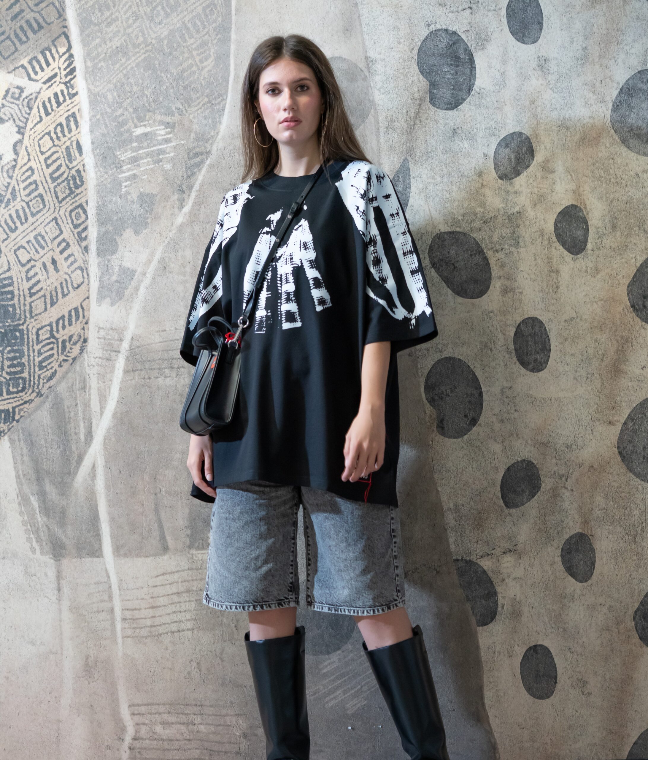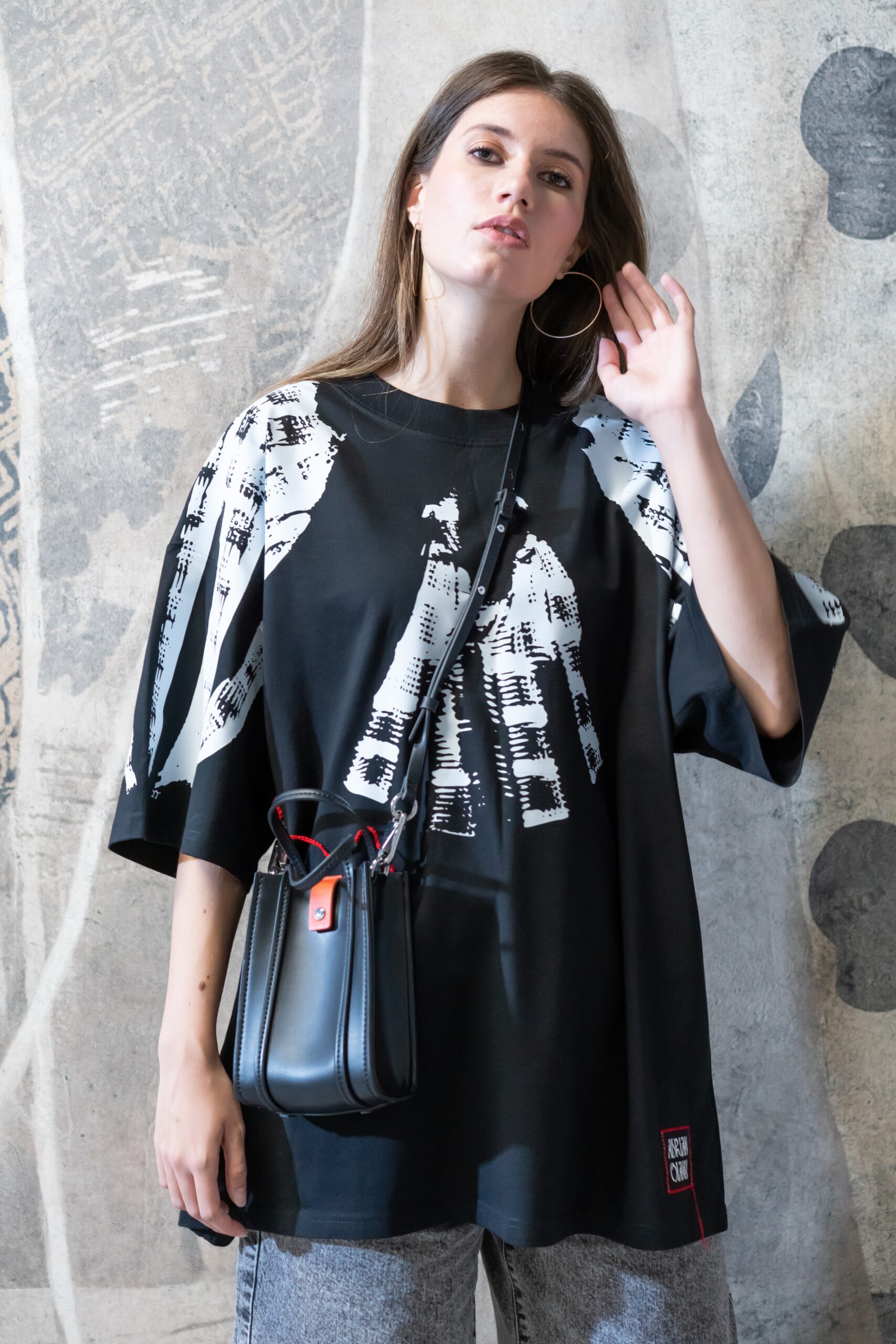 De culoare neagra, cu print aplicat manual, tricoul are in jurul taliei doua snururi, care pot fi legate in fata sau in spate pentru o talie marcata. Pe conturul logo-ului, am brodat, cu acelasi rosu, pentru a sublinia importanta mestesugului in brandul nostru.